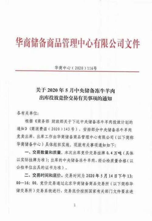 同日,華儲網還發布《關于2020年5月中央儲備凍牛羊肉出庫投放競價交易有關事項的通知》稱,5月14日將出庫投放競價交易0.4萬噸中央儲備凍牛羊肉。