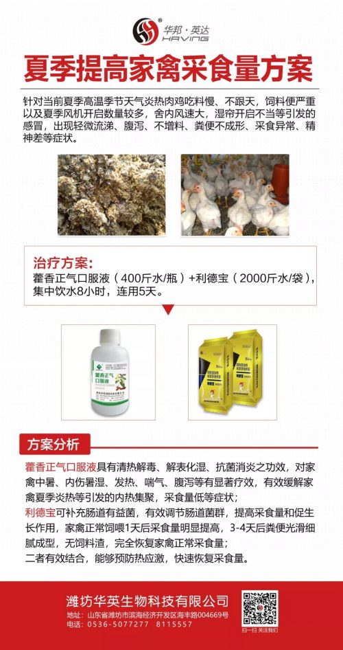 ? ? ? 方案分析:藿香正氣口服液具有清熱解毒、解表化濕、抗菌消炎之功效,對家禽中暑、內傷暑濕、發熱、喘氣、腹瀉等有顯著療效,有效緩解家禽夏季炎熱等引發的內熱集聚、采食量低等癥狀;