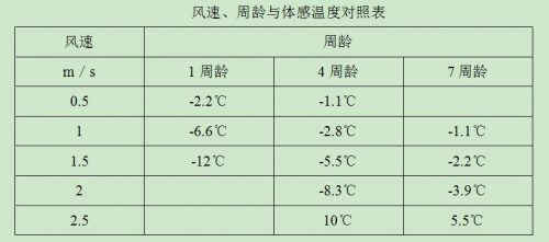體感溫度,簡單的說,就是雞體所能感覺到的溫度,而不是實(shí)際溫度。在濕度適宜的時(shí)候,當(dāng)雞舍里的溫度計(jì)顯示為28℃時(shí),在沒風(fēng)的情況下,雞體感覺到的溫度是28℃。如果此時(shí)舍外有冷風(fēng)吹進(jìn)來,風(fēng)速是1m/s的話,雞體感覺到的溫度就不在是溫度計(jì)上顯示的28℃了,而實(shí)際感受到的溫度會(huì)比溫度計(jì)上的溫度低3~5℃。雞體感覺的溫度和溫度計(jì)上的顯示不一樣了,這就是風(fēng)冷效應(yīng),而雞體實(shí)際感受到的溫度,就是體感溫度。體感溫度是沒有辦法測量的,也是沒有辦法計(jì)算的,它受溫度、相對濕度、風(fēng)速、雞只大小、雞只健康狀況、羽毛覆蓋程度、風(fēng)的溫度與雞群的密度等因素影響。