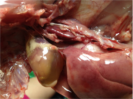 以心包積液、出血性肝炎為特征,發病急、傳播快,發病家禽的特征性癥狀是無明顯先兆而突然倒地,兩腳劃空,數分鐘內死亡。其剖檢變化主要為死亡家禽有明顯的心包積水,心包呈水囊狀;肝臟腫大、質脆且充血,外觀呈淺黃至深黃色,肺臟淤血水腫。